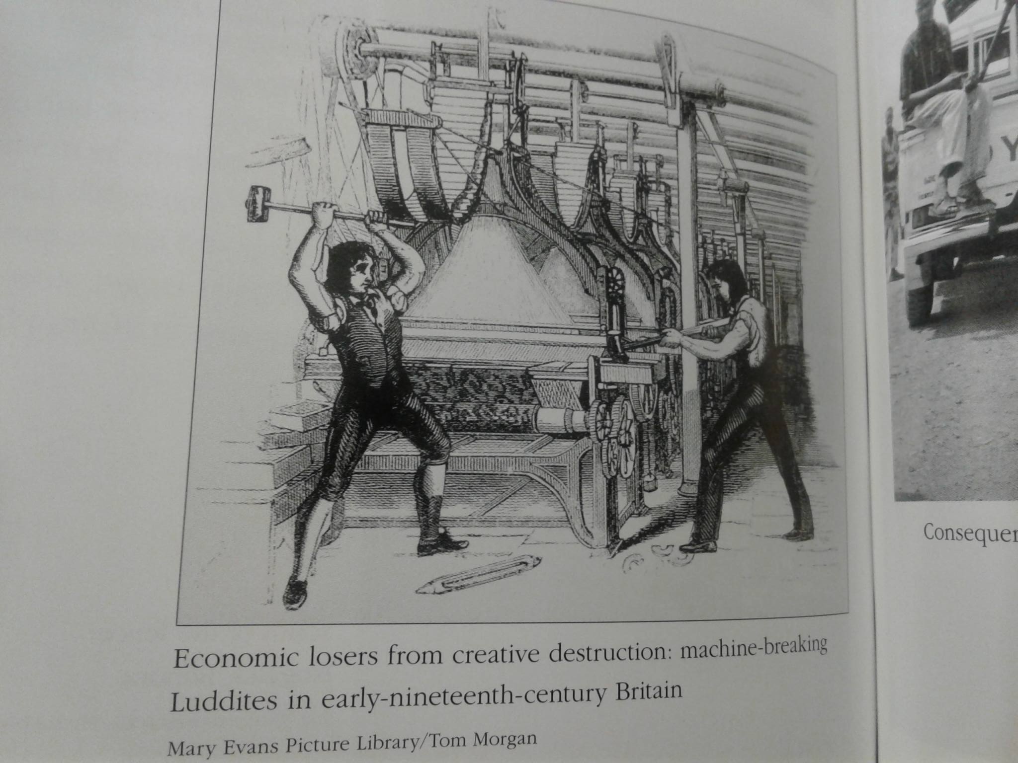 -다시 사진으로 돌아온다. 저 사진은 아주 유명한 러다이트 운동을 묘사하고 있다. 이 저자들이 숭배하는 슘페터의 "창조적 파괴"가 아니다. 그래서 아체모글루와 로빈슨이 제목을 이렇게 달았다 "창조적 파괴와는 거리가 먼 경제적 패배자들: 19세기 초반 영국에서 기계를 파괴하는 경제적 패배자들 economic losers"