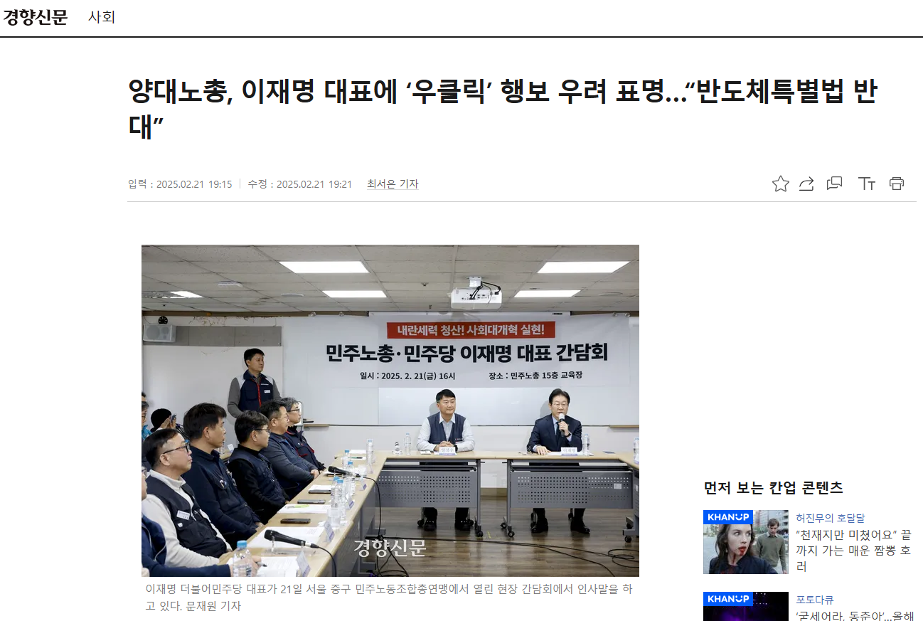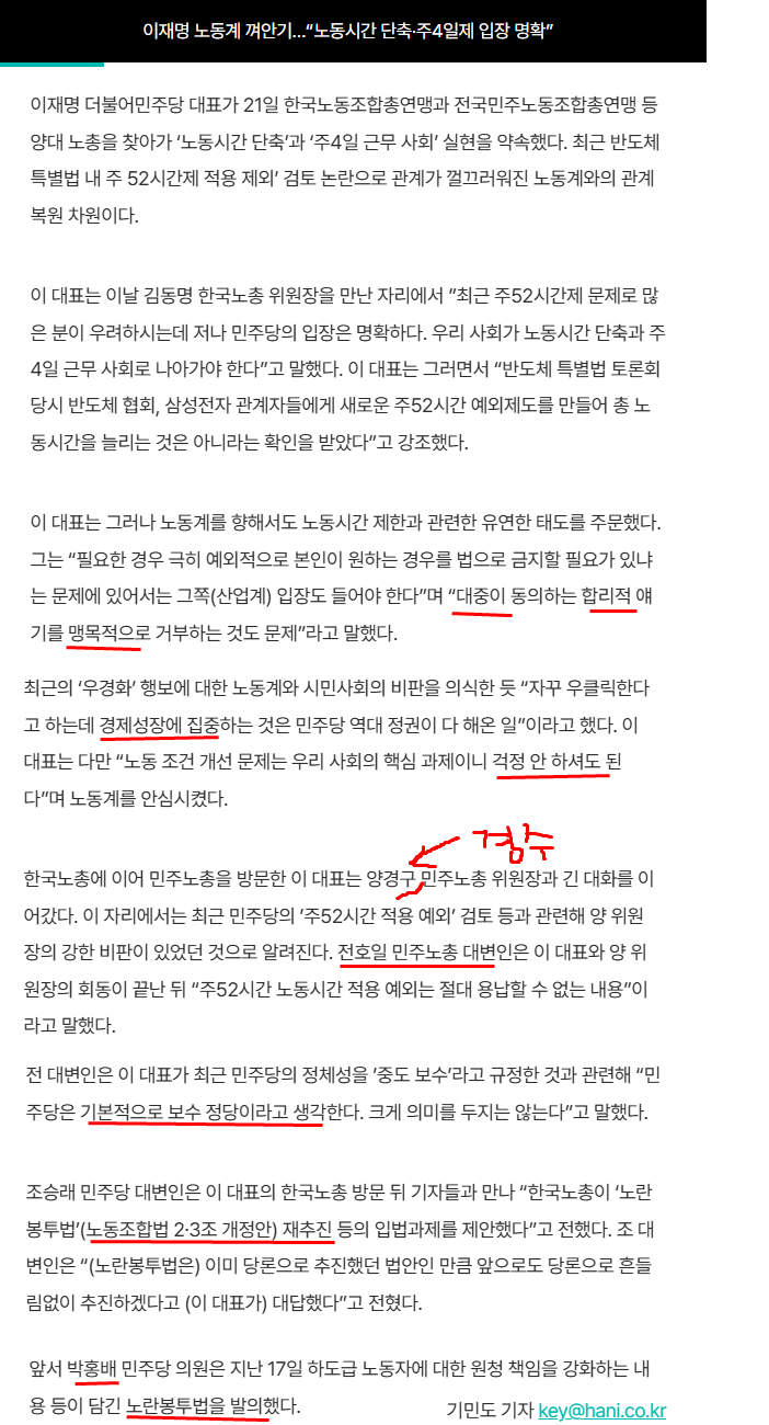 한겨레 신문 제목 "이재명 노동계 껴안기"는 잘못되었다. 입장 차이만 확인했고, 이재명의 잘못된 노동자관만을 드러냈다. '내란세력 종식, 사회대개혁'이라는 구호가 무색할 정도다.