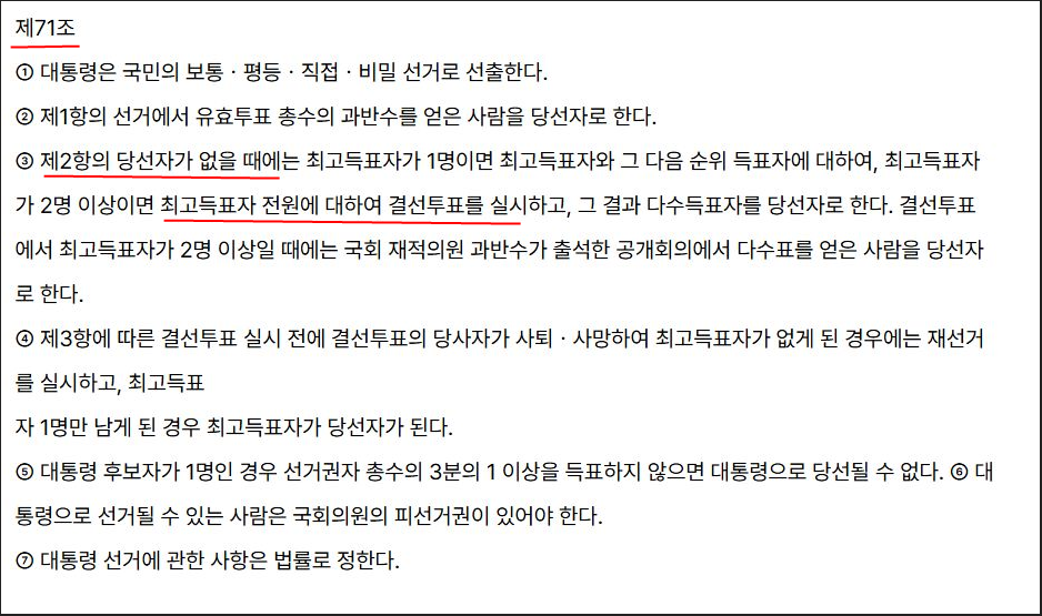 1. 2018년 문재인 개헌안에 '대통령 결선투표제' 내용이 추가됨. 문재인 대통령이 국회에 '개헌안'을 발의했지만, 자유한국당(새누리당 후신,122명 의원)이 전원 불참. 민주당(123명 의원 중, 당시 정의당 6명) 등 112명만 참가. 의결정족수 미달로 투표 자체 불가능, 개헌안 발의도 되지 못하고 실패로 끝남 ( 개헌안이 국회에 통과되려면, 재적의원의 3분의 2 찬성 필요.)