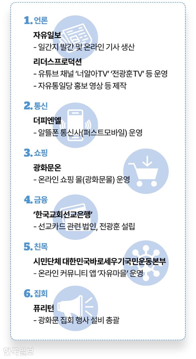 전 목사가 창당한 자유통일당의 광고 용역을 맡고 유세 용품을 조달하는 등 ‘내부 거래’가 일상이다. 이 돈의 상당 부분은 자유통일당이 사랑제일교회에서 빌린 것이다. 5년간 차입금이 69억 원이다. 교인과 집회 참가자로부터 십시일반 걷은 헌금이 자유통일당을 거쳐 그의 일가와 핵심 측근들이 운영하는 기업과 단체로 흘러 들어가는 것이다.