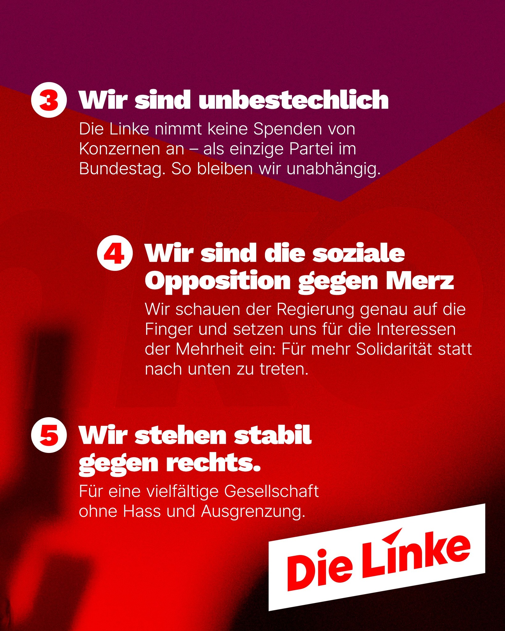 4. 좌파당은 기민당의 메르츠에 반대하는 사회적 야당이다. 좌파당은 정부를 면밀히 감시할 것이고, 다수의 이해관계를 위해 노력할 것이다. 문제를 회피하는 것 대신 더 많은 연대를 위해.
