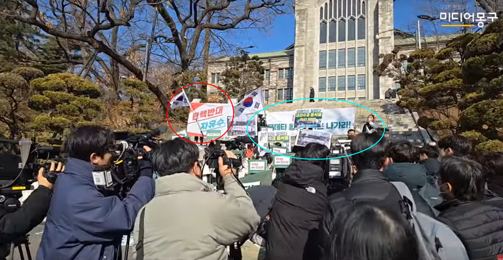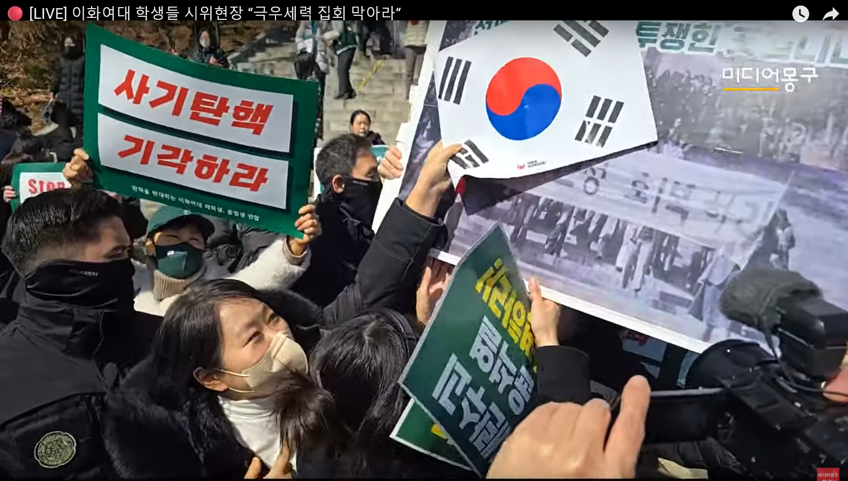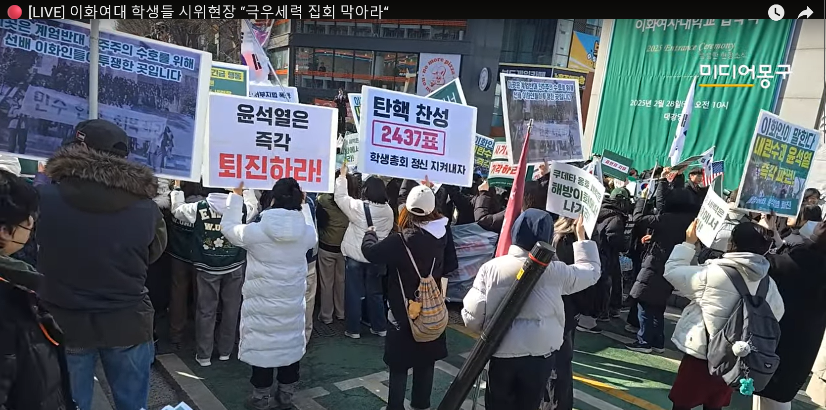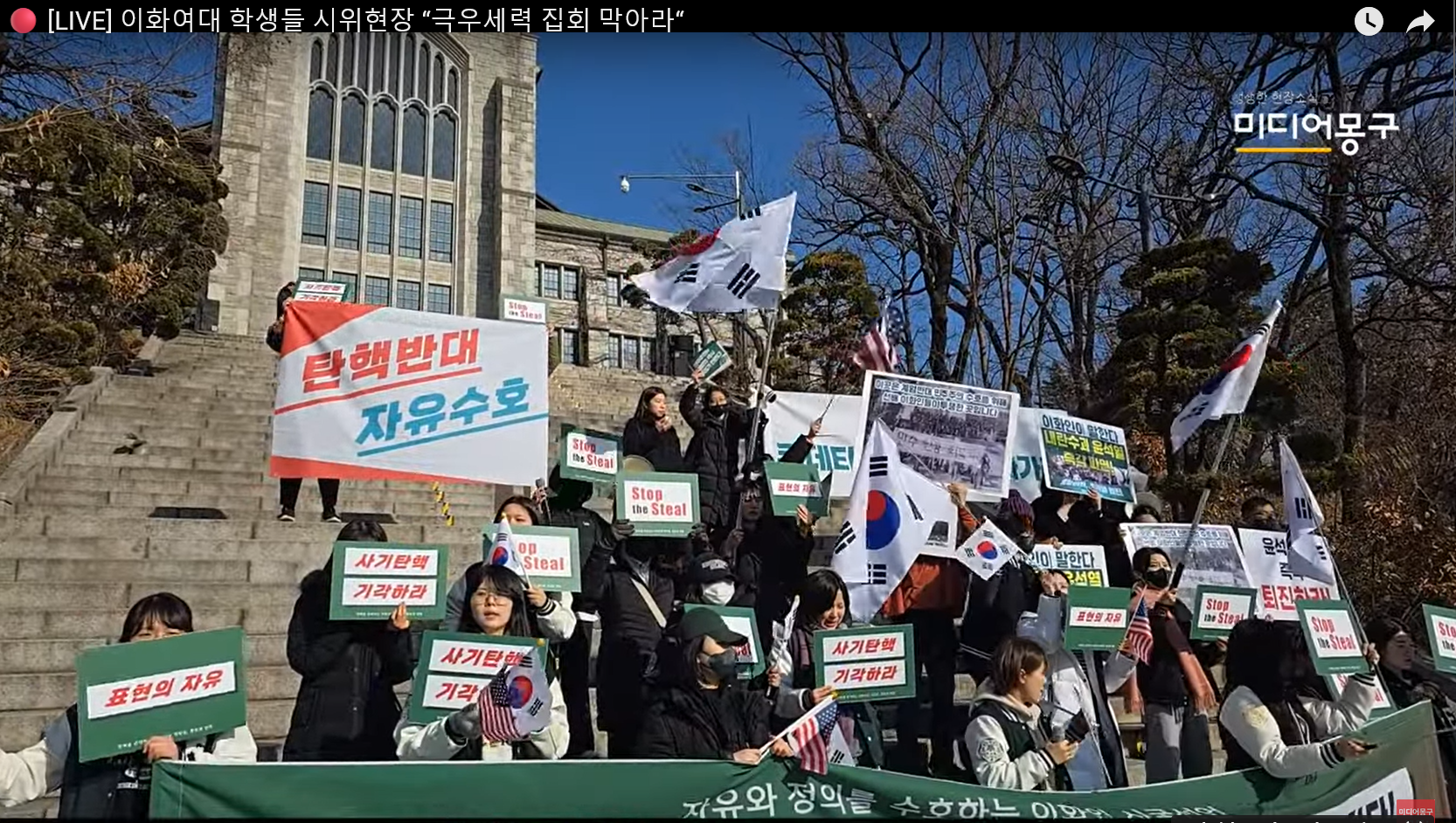 이들 옆에서는 10~20여 명의 학생들이 "탄핵 찬성 2437표, 학생총회 정신 지켜내자", "쿠데타 옹호 세력은 해방 이화에서 나가라"는 피켓을 들고 뒤섞여 집회를 벌였다.