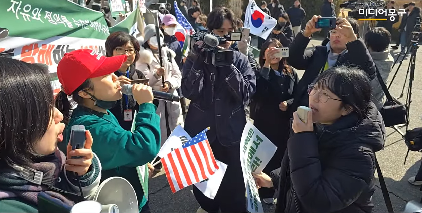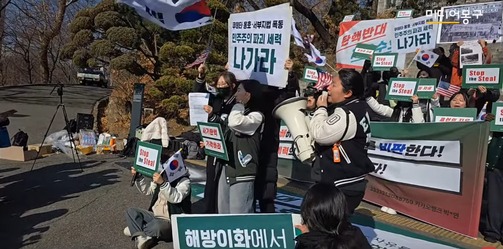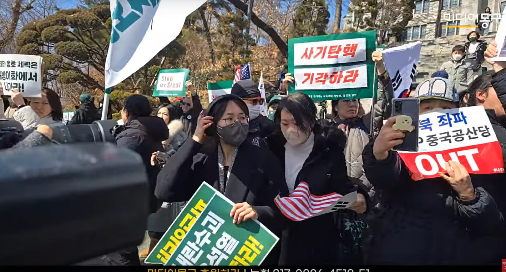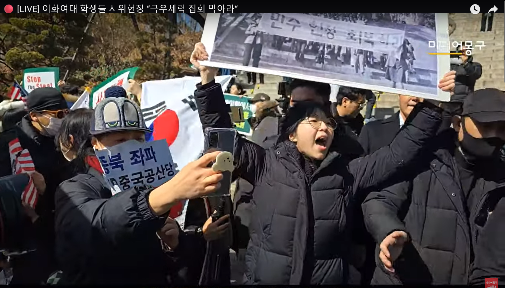 태극기 부대가 태극기로 윤석열 탄핵하라 구호를 외치는 학생과 그 사진을 태극기로 가리고 있다.