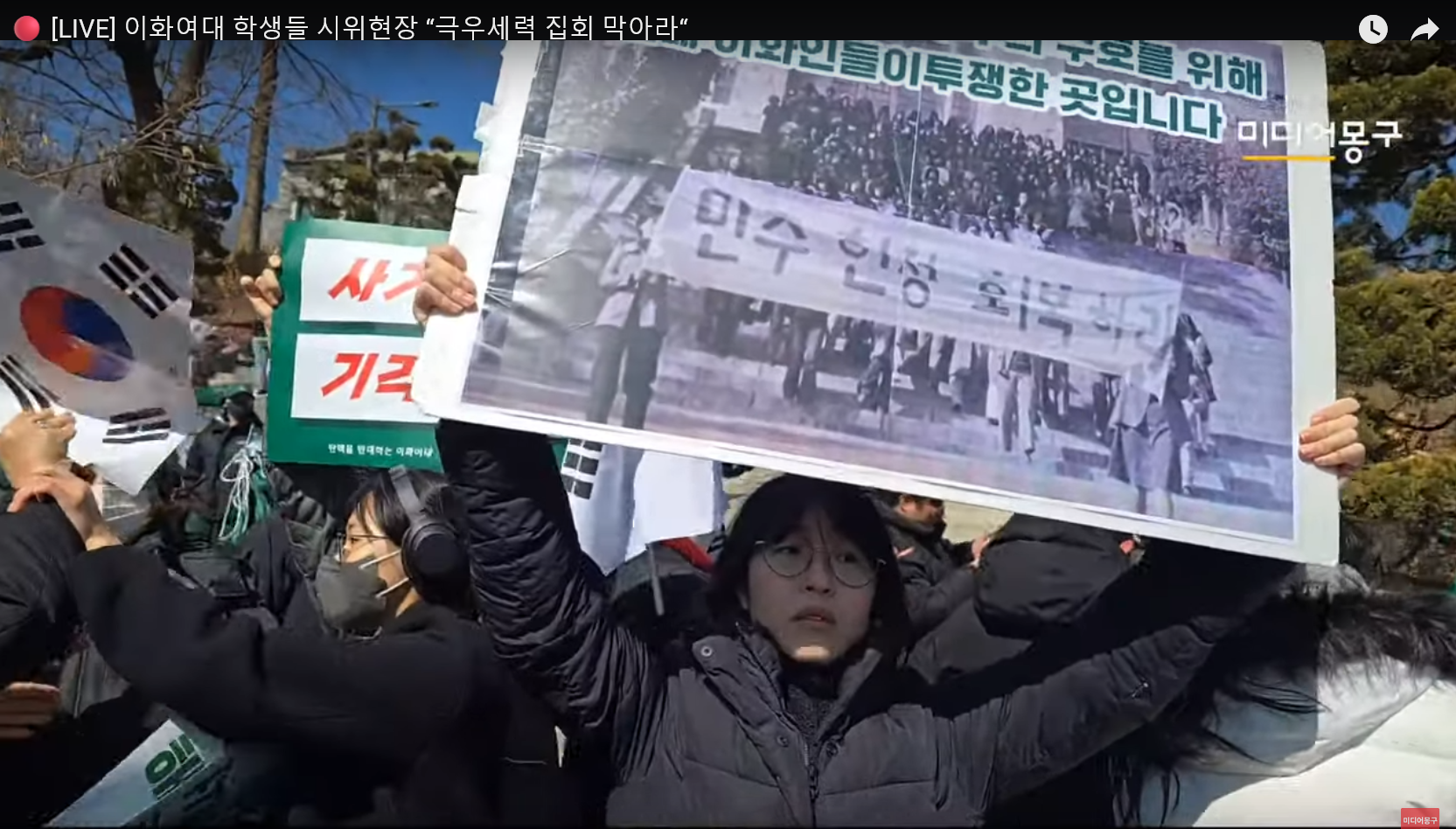 아수라장이 된 이화여대 대강당 앞에서 윤석열 퇴진을 외치던 학생들은 "이곳(이화여대 대강당 앞 계단)은 계엄 반대, 민주주의 수호를 위해 선배 이화인들이 투쟁한 곳"이라는 문구와 옛 사진이 담긴 피켓을 들고 고개를 숙인 채 항의했다.
