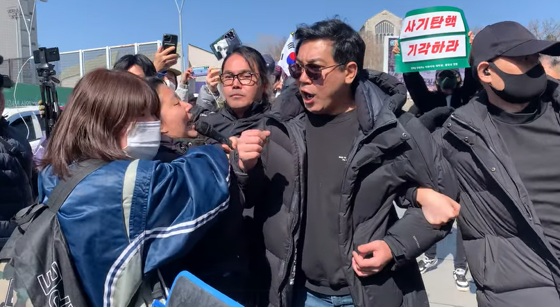 윤석열탄핵반대 구호를 외치는 한 남성을 교문 바깥으로 밀어내다.