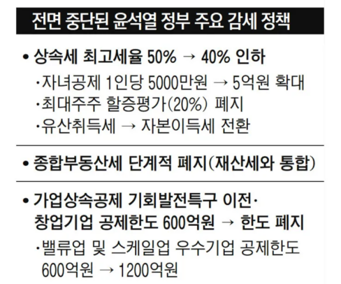 윤석열 감세 추진 (현재 중단) 상속세 최고세율 50%에서 40%로 인하 예정 (상속세 및 증여세법)
