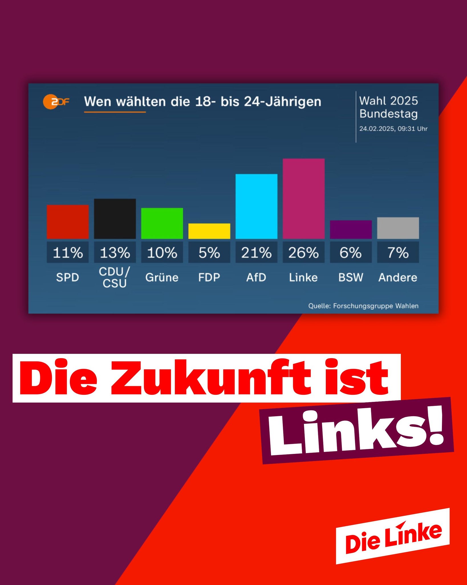 독일 청년 유권자, 18세~24세 사이 유권자들의 26%가 좌파당에 투표했다.그러나 극우정당 AfD에도 21% 가 투표했다. 독일이 닥친 현실을 있는 그대로 보여준다. 특히 구동독지역 청년들이 기존 사민당 지지에서 돌아서 AfD를 선택하고 있는 점을 예의주시해야 한다.