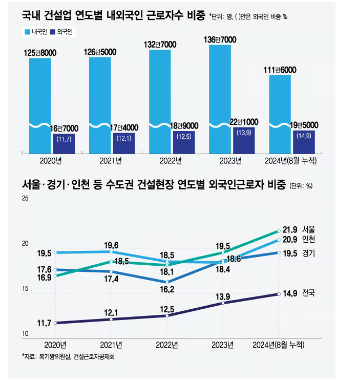 서울·경기·인천 등 수도권의 건설 현장 근로자 5명 중 1명은 외국인 근로자로 확인됐다. 내국인 근로자는 60대 이상 고령자 수가 급증하는 추세다. 건설 현장이 외인화, 고령화되고 있다.