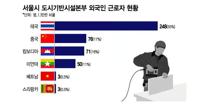각 현장에서 일하는 외국인 근로자는 적게는 13명(양재대로 구조개선공사) 많게는 119명(동북선 도시철도 4공구)에 달한다. 국적도 태국·캄보디아·미얀마·중국 등 다양하다.