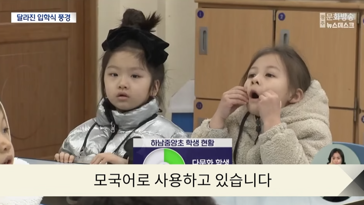 광주의 초등학교가 다문화주의 multiculturalism 교육을 실시하고 있다. 러시아를 집에서 사용하는 어린이들이 초등학교에 입학했다. 학교에서 한국어를 배우고, 통역 선생님들도 아이들의 학습을 도와준다.