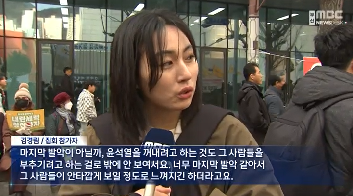 김경림 (부산 서면 ) 마지막 발악이 아닐까, 윤석열을 꺼내려고 하는 것도 그 사람들을 부추기려고 하는 걸로 밖에 안 보여서요. 너무 마지막 발악 같아서 그 사람들이 안타깝게 보일 정도입니다.