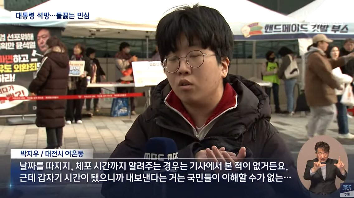 박지우 (대전시 어은동) 날짜를 따지지, 체포 시간까지 알려주는 경우는 기사에서 본 적이 없거든요. 근데 갑자기 시간이 됐으니까 (윤석열을) 내보낸다는 거는 국민들이 이해할 수가 없는.....