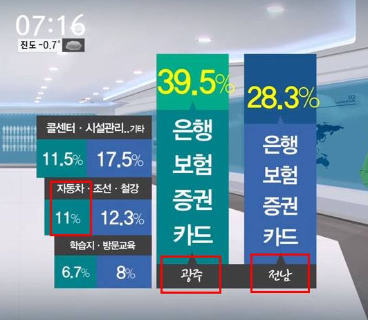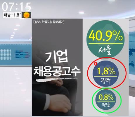 2016년 4월 9일, 한국 지방균형 발전 현황이었다. 광주 1.8%, 전남 0.8%, 서울 40.9%, 기업채용공고숫자 비율이다.