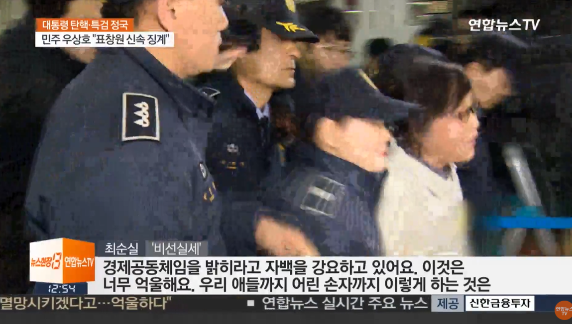 "여기는 더이상 민주주의 특검이 아닙니다. 어린애와 손자까지 멸망시키겠다고 그러고 이땅에서 죄를 짓고…그리고 박 대통령과 경제공동체임을 밝히라고 자백을 강요하고 있어요. 이것은 너무 억울해요. 우리 애들까지 다 어린 손자까지 이렇게 하는 것은…"
