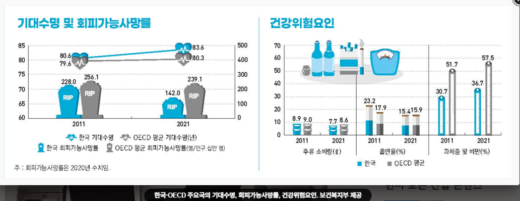 한국·OECD 주요국의 기대수명, 회피가능사망률, 건강위험요인. 보건복지부 제공