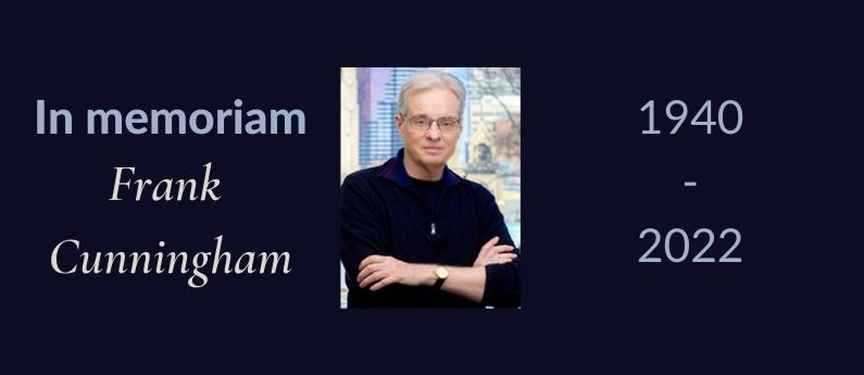 Portrait of Frank Cunningham on a dark blue background with the words "In memoriam Frank Cunningham, 1940-2022.