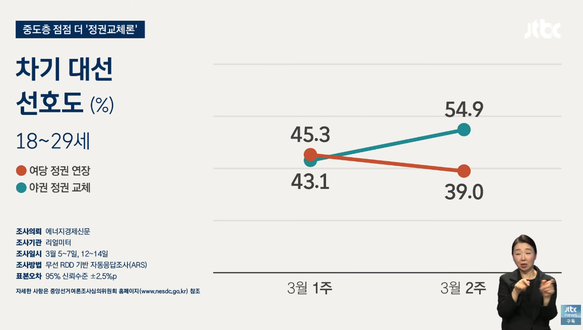 20대 이하에선 1주일 전 정권교체와 정권 연장 여론이 불과 2.2%P차였지만 이번 조사에선 정권교체 여론이 15.9%P 더 높은 걸로 나타났습니다.