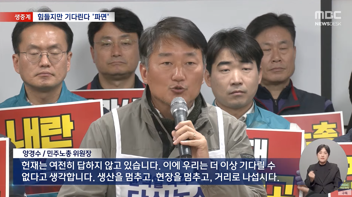 "헌재는 여전히 답하지 않고 있습니다. 이에 우리는 더 이상 기다릴 수 없다고 생각합니다. 생산을 멈추고, 현장을 멈추고, 거리로 나섭시다."