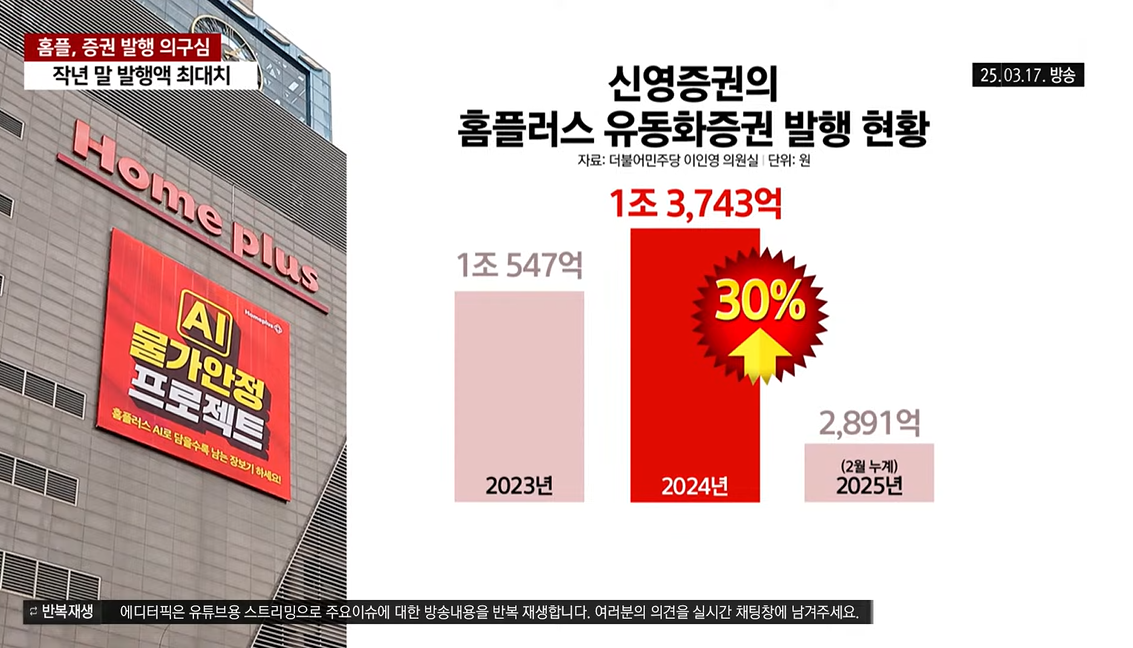 (신영증권 홈플러스 유동화증권 ABSTB 발행 현황. 2024년 1조 3743억원 (전년 대비 30% 증가)