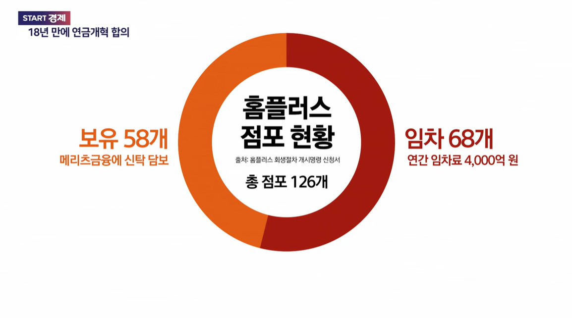 홈플러스 점포 현황. 총 126개 (보유 58개, 메리츠 금융에 신탁 담보), 임차 68개 (연간 임차료 4천억원)