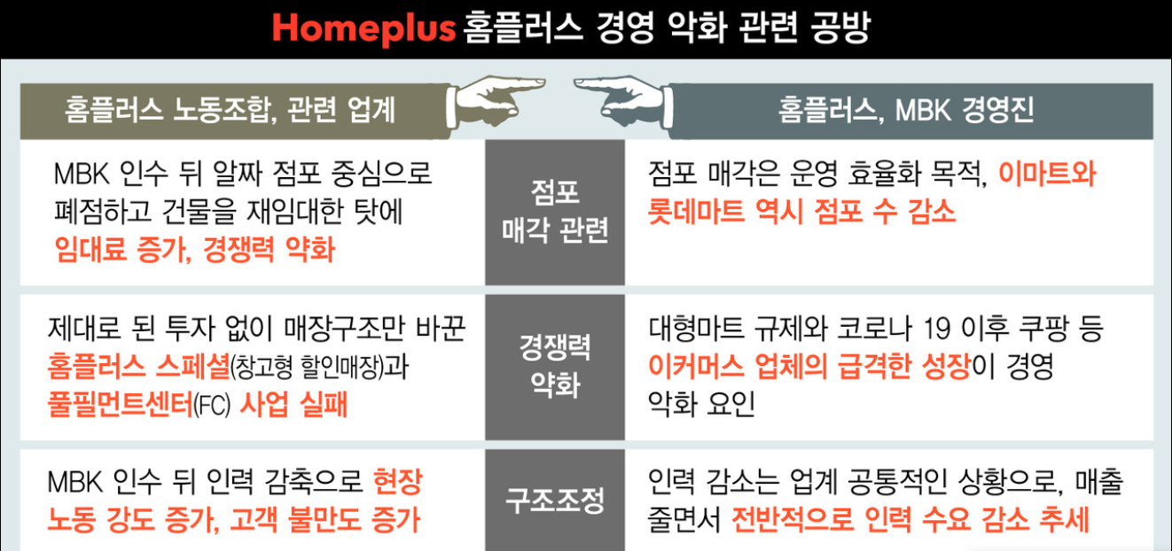 그러면서 홈플러스 쪽은 경영악화 요인으로 대형마트 의무휴업, 영업시간 외 배송금지, 코로나19 기간 매출 감소, 직원 정규직 전환으로 인한 비용 증가 등을 들었다. 김광일 대표는 “대형마트 규제는 풀리지 않는데 코로나19로 (고객들은) 집밖으로 나오지 않았고, 저희는 (직원을) 전부 정규직으로 전환해서 코로나 3년을 견뎌냈다. 그 기간에 회사가 손실이 날 수 밖에 없었다”고 말했다.