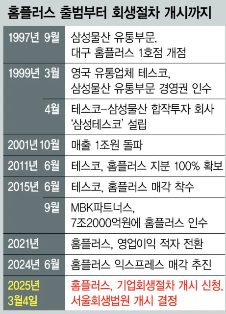 홈플러스의 위기는 10년 전 사모펀드 엠비케이(MBK)파트너스가 자금을 대규모로 차입해 홈플러스를 인수했을 때 발아했다. 엠비케이파트너스는 영국 유통기업 테스코로부터 홈플러스를 7조2천억원에 인수하면서, 4조3천억원을 인수금융으로 조달했다. 당시 아시아 최대 규모의 바이아웃(재매각 목적 기업 인수)으로 주목받았지만, 대규모 차입 인수는 두고두고 홈플러스에 부담이 됐다. 홈플러스는 이후 20여개의 점포를 매각하거나 재임대하는 방식으로 처분해 부채 4조원을 우선 상환하는 데 집중했다.