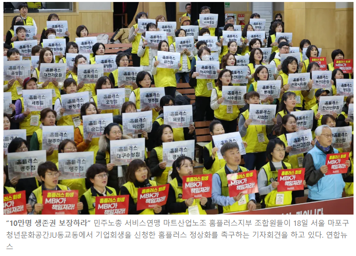 민주노총 서비스연맹 마트산업노조 홈플러스지부는 18일 기자회견을 열어 “MBK는 우량기업이던 홈플러스를 의도적으로 부실기업으로 만들고 투자금 회수를 위한 청산을 목적으로 회생절차를 발표했다”며 “1년 중 매출이 가장 높은 ‘홈플런’ 행사 직후 회생을 발표해 납품을 지연시키고 온라인 배송 상품 출고를 막아 매출을 급격히 위축시켰다. 이는 고의적인 경영 악화 조장 행위”라고 했다.