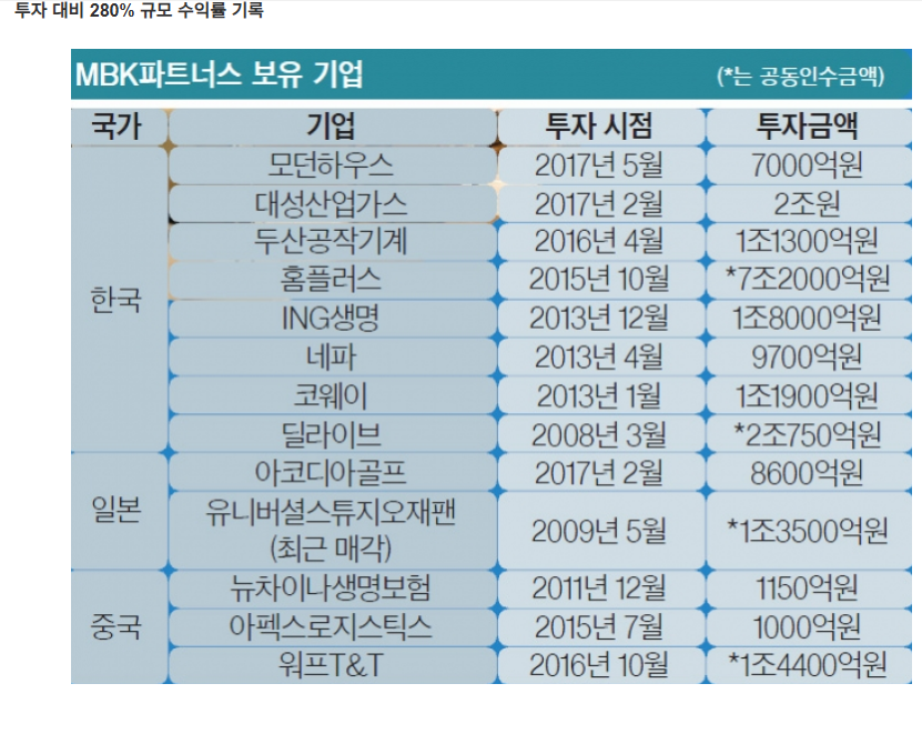 MBK 는 홈플러스 매입과정에서, 홈플러스가 7조 2천억원의 빚을 떠안고 출발하게 만들었다. 이것이 차입매수 (LBO -leveraged Buyout)이다. MBK가 홈플러스 전신 회사의 자산을 담보로 2조 7천억원을 빌렸다. 나머지 3조 2천억원은 펀드 및 투자자.