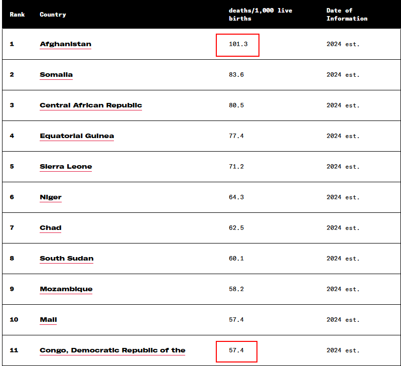 1000명이 태어나면 1세 미만에 사망한 아이 숫자가, 아프가니스탄 101.3명, 소말리아 83.6명, 콩고 57.4명, 아프리카 국가들이 이 고통을 당하고 있다.