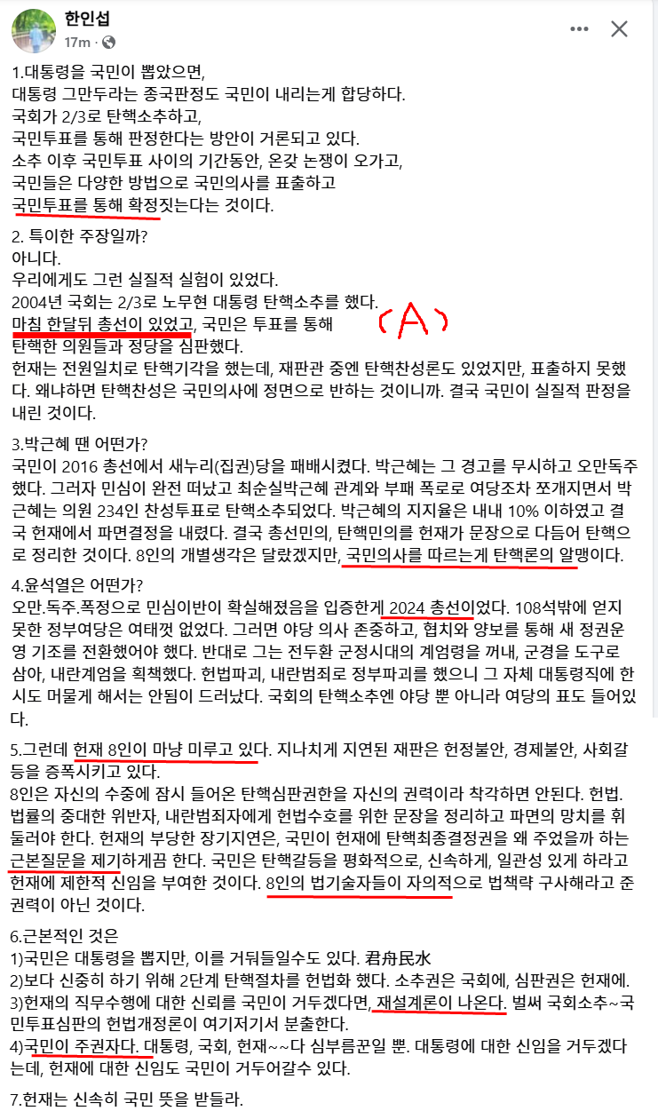 3)헌재의 직무수행에 대한 신뢰를 국민이 거두겠다면, 재설계론이 나온다. 벌써 국회소추~국민투표심판의 헌법개정론이 여기저기서 분출한다.