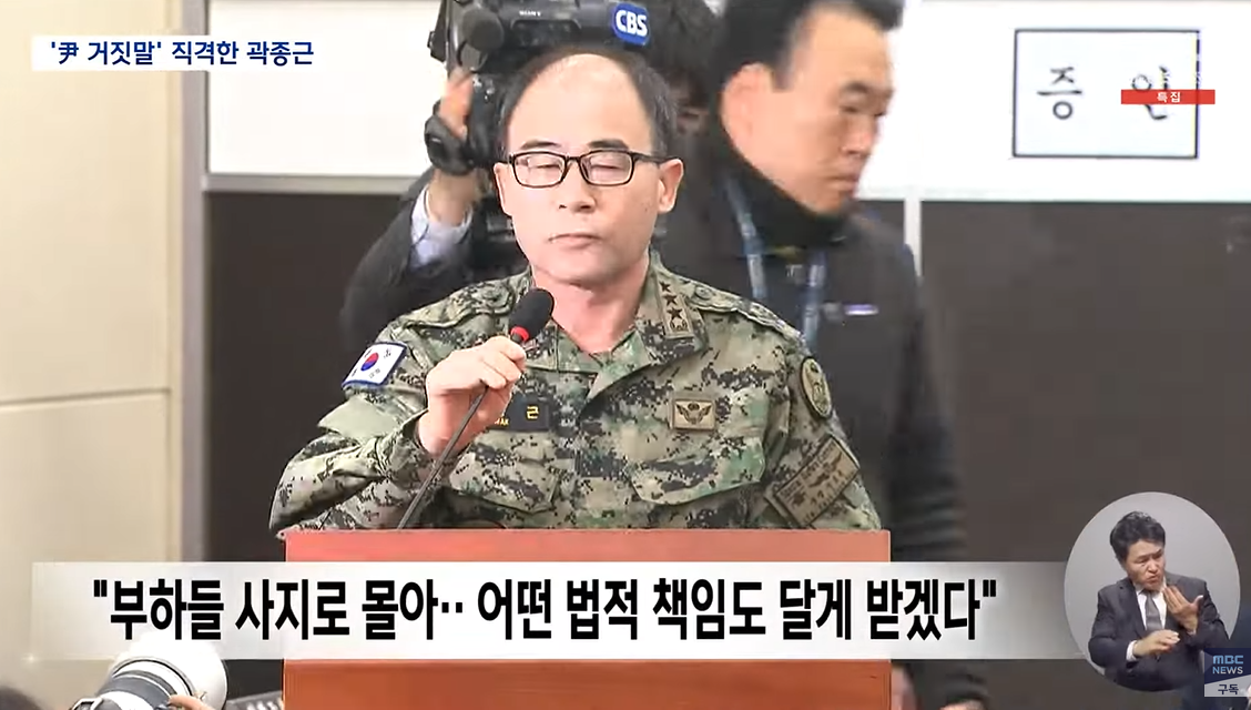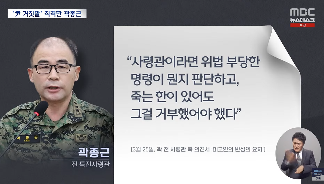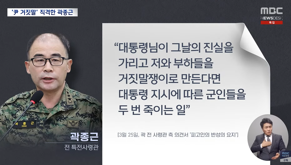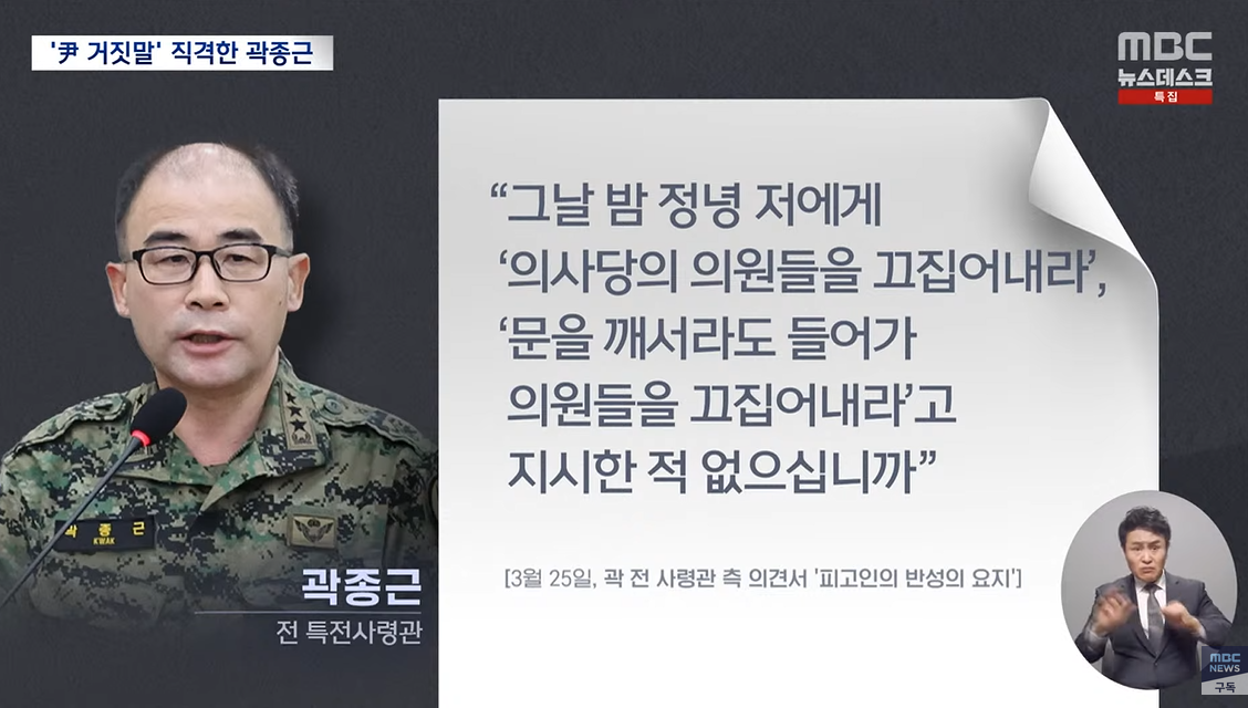내란 혐의로 재판을 받고 있는 곽종근 전 특전사령관이 "정녕 의원들을 끄집어내라고 지시한 적이 없냐"며 윤 대통령을 직격했습니다.