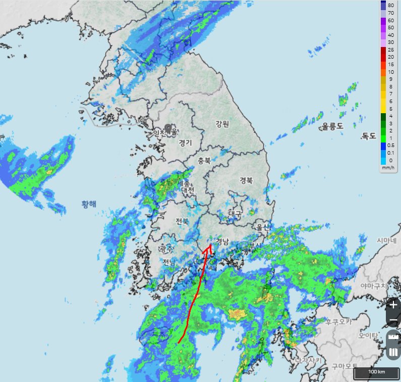 5:50 pm 대구 쪽에는 비가 흩뿌리고, 남해안 부산, 울산 일부는 비가 내린다.