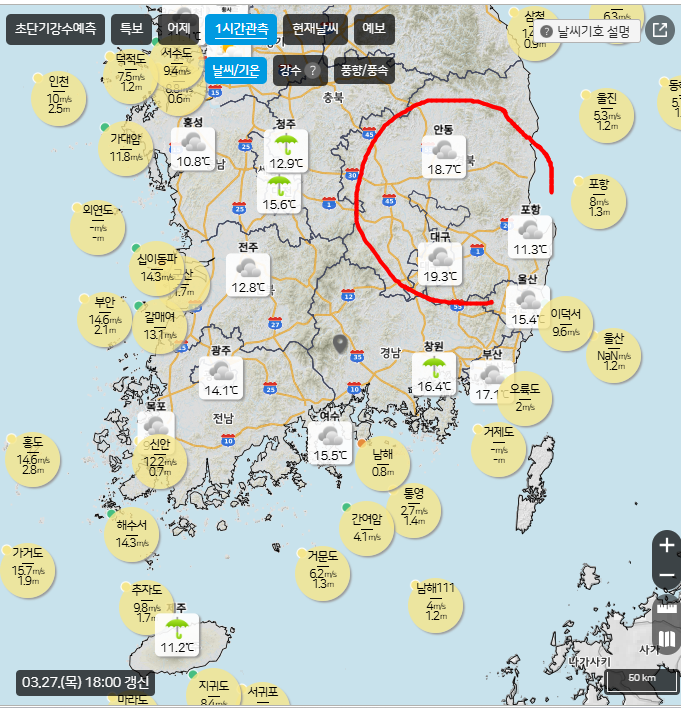 12:34 am 의성, 안동시,영양군, 청송군, 영덕군, 울진군에 비가 내림. 영양군과 울진군에는 비가 조금 더 많이 내림