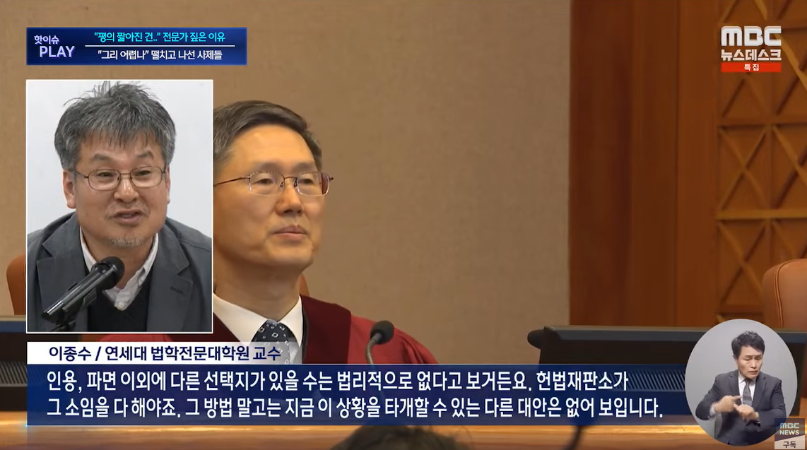 이종수 (연세대 법학 교수) 윤석열에 대한 탄핵인용, 파면 결정 이외에 다른 선택지가 없다. 헌법재판소가 그 소임을 다해야 한다. 그 방법을 제외하고는 다른 대안은 없다.