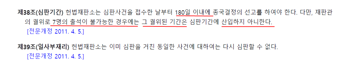 제38조(심판기간) 헌법재판소는 심판사건을 접수한 날부터 180일 이내에 종국결정의 선고를 하여야 한다. 다만, 재판관