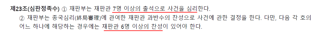 제23조(심판정족수) ① 재판부는 재판관 7명 이상의 출석으로 사건을 심리한다.