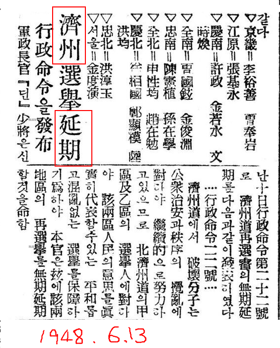 1948년 6월 13일자 동아일보. 미군장관 Dean 딘 소령. "제주 총선 연기" 행정명령을 발포.
