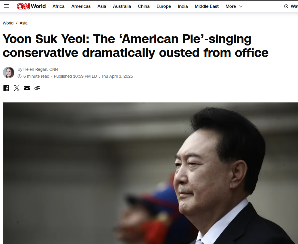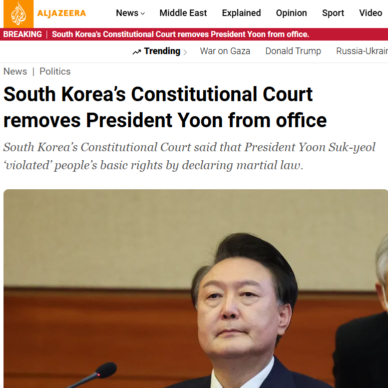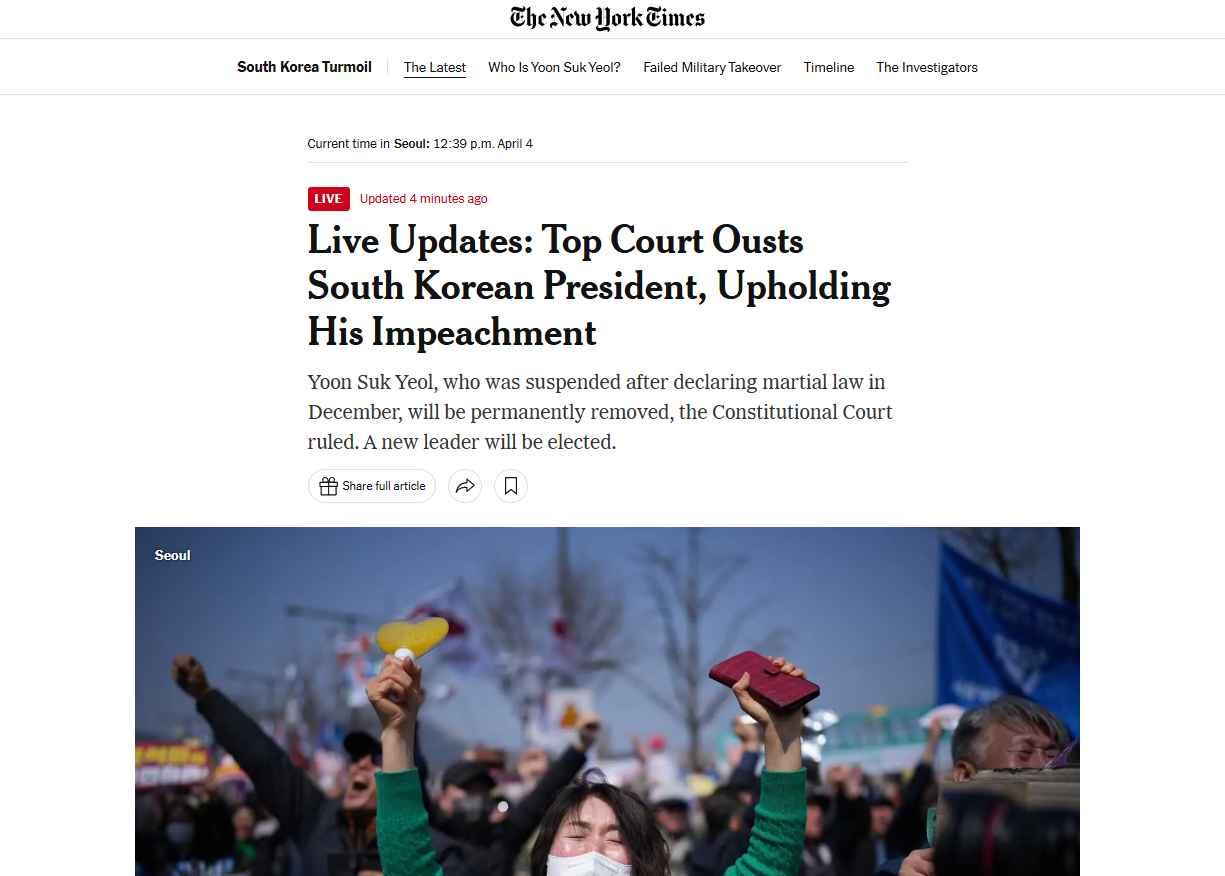 헌법재판소 윤석열 탄핵 인용. 파면 , 외신 보도 CNN, New York Times, 알 자지라, 가디언 등