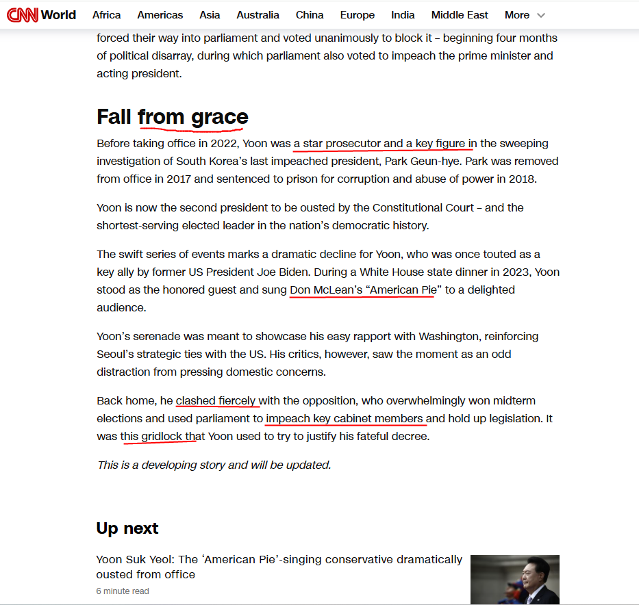 백악관에서 조 바이든의 초대를 받은 윤석열이 어메리컨 파이 American pie 노래를 불렀던 윤석열이 탄핵당했다고 보도.