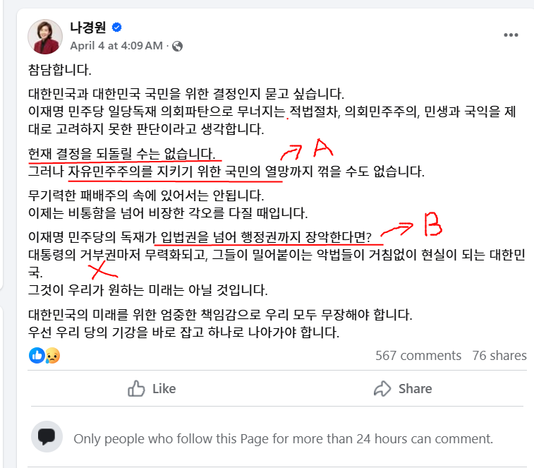 두번째는 국민의힘이 탄핵과정 동안에 최대한 '하나로' 뭉쳐 있어야 나경원이 차기 지도부에 탑승할 수 있다. 나경원은 당대표 선거에서 김기현에게 강제적으로 양보한 적이 있다. 윤석열이 김기현을 채택하고 나경원을 강제로 주저앉혔다. 그 수모를 겪고도 나경원은 탈당하거나, 윤석열에 저항하지 않았다.