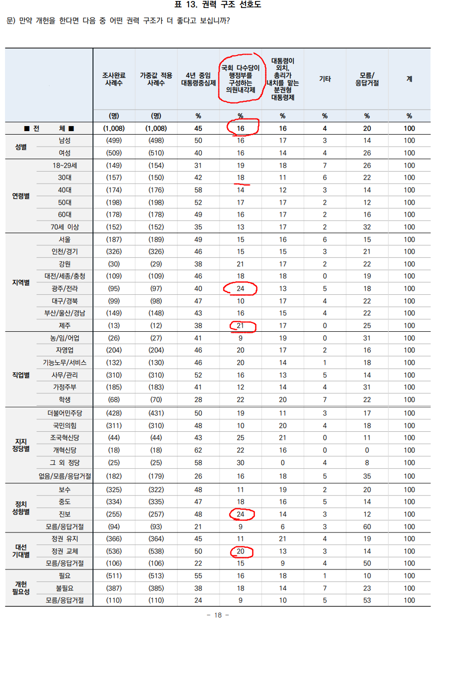 광주전라가 의원내각제 24%, 4년 중임제 40%, 분권형 13%