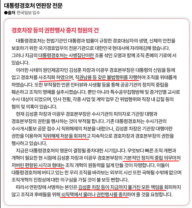연판장은 ①'경호처가 사조직화되고 있다'는 우려로 시작된다. 경호관들은 "김 차장과 이 본부장은 부적절한 언론 인터뷰와 사생활 등을 통해 공공기관의 정치적 중립을 훼손하고 조직의 명예를 실추시켰다"며 "직권남용 등 갖은 불법행위를 자행해 조직을 위태롭게 했고, 특수공무집행방해 및 증거 인멸 교사로 수사 대상이 됐다"고 직격했다.