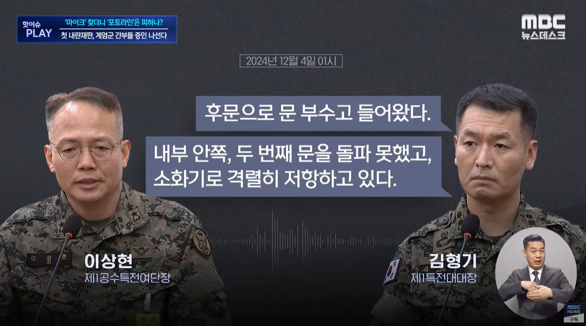 김 대대장이 "후문으로 문 부수고 들어왔다"며 "내부 안쪽, 두 번째 문을 돌파 못 했고, 소화기로 격렬히 저항하고 있다"고 하자, 이 여단장은 "대통령님이 문 부숴서라도 끄집어내오래"라며 대통령의 지시 사항임을 명확히 밝힙니다.