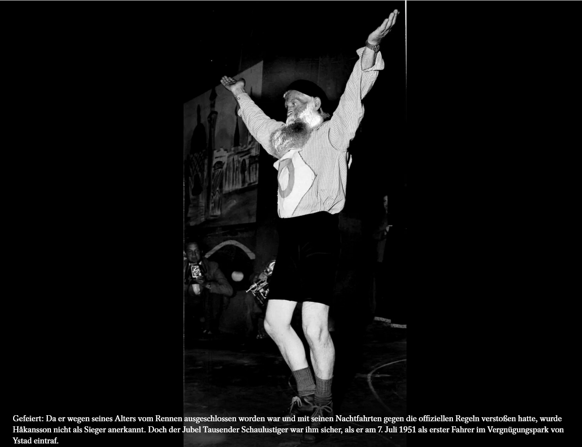 Håkansson allerdings dachte gar nicht daran, sich abwimmeln zu lassen: Kurzerhand nähte er sich selbst eine Startnummer – die Null. Und als am 1. Juli 1951 die 50 anderen Fahrer, Jahrzehnte jünger als er, am Start in Haparanda erschienen, reihte er sich mit seinem Rostrad ein. Sein Doping beschränkte sich auf etwas Zuckerwasser und ein paar schwedische Makronentörtchen.