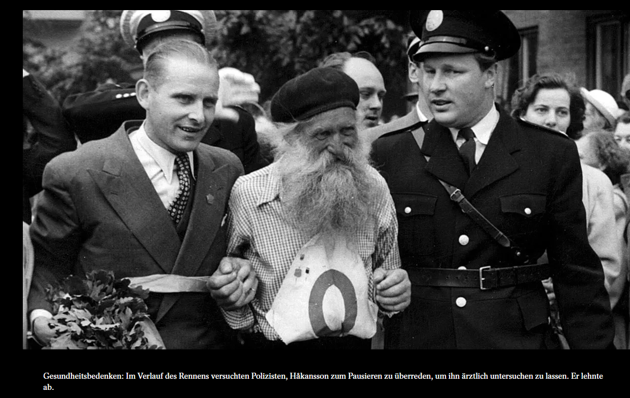 Als Erster auf die Zielgerade bog kein Hochleistungsathlet – es war der Fahrer mit der seltsamen Startnummer null: ein faltiger Greis mit wallender Mähne, so schneeweiß wie sein Weihnachtsmannbart. Ein Redakteur des »Expressen« beschrieb den Anblick so: