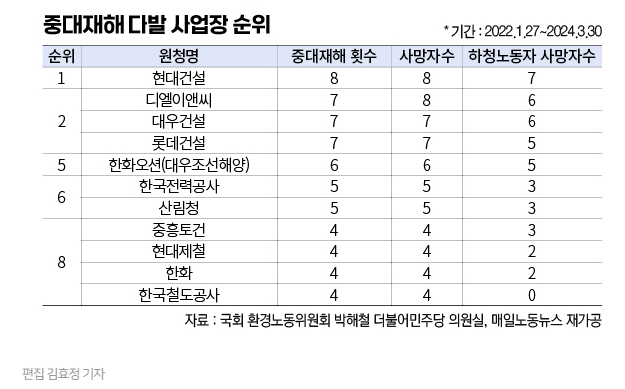 이어 디엘이앤씨(사망 8명)와 대우건설(사망 7명), 롯데건설(사망 7명)에서 각 7건의 중대재해가 발생해 공동 2위를 차지했다. <매일노동뉴스>가 23일 국회 환경노동위원회 박해철 더불어민주당 의원실을 통해 입수한 ‘2022년 1월27일~2024년 3월30일 중대재해 사망 발생 원·하청 사업장 명단’을 분석한 결과다. 고용노동부는 2022년 중대재해처벌법 시행 이후 중대재해 발생사업장 명단을 비공개했다. 국회 환경노동위원들의 자료제출 요구도 모두 거부했다. 전체 자료가 공개된 것은 이번이 처음이다.