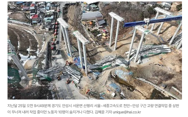 지난달 25일 오전 9시 49분께 현대엔지니어링이 시공 중인 서울세종고속도로 천안~안성 구간 9공구 청룡천교 건설 현장에서 교각 위 거더가 붕괴하는 사고가 발생했다. 이로 인해 작업자 10명이 추락·매몰돼 4명이 숨지고, 6명이 다쳤다.