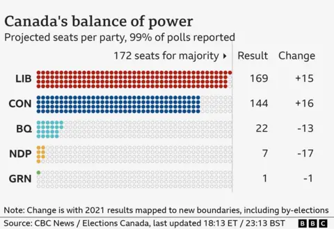 The Liberals are projected to have won 169 seats, three short of the 172 needed for a majority in Canada's House of Commons.