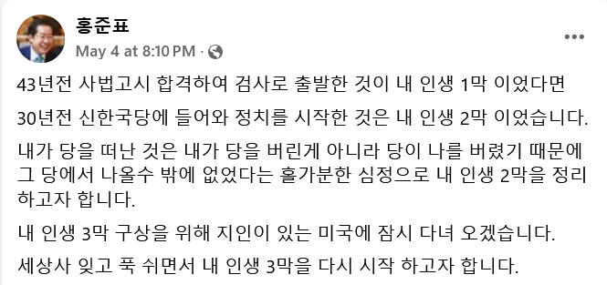 3. 홍준표는 국민의힘 대선 후보 경선에서 탈락하자, 윤석열과 권영세 권성동 등 당지도부가 한덕수를 지원하고, 홍준표 자신과 김문수는 들러리로 만들었다고 그들을 비난했다.