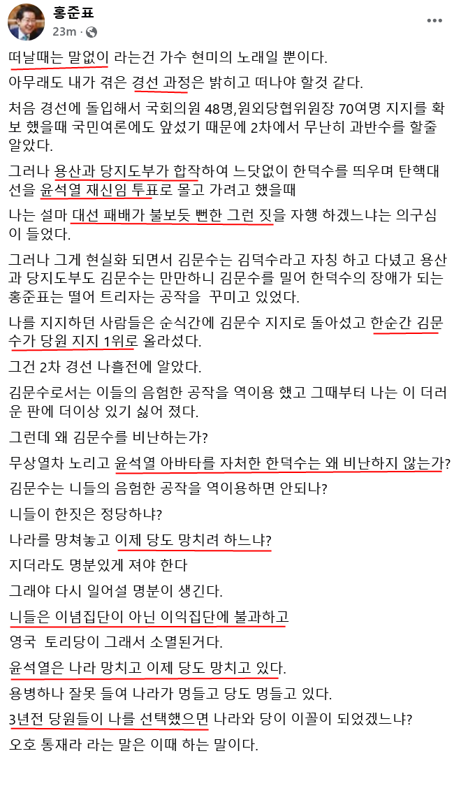 1. 홍준표는 국민의힘 당을 망친 주범이 당바깥 인사 '윤석열'과 '한동훈'이라고 단정하고, 이들을 끌어들인 국힘 당권파라고 생각한다.